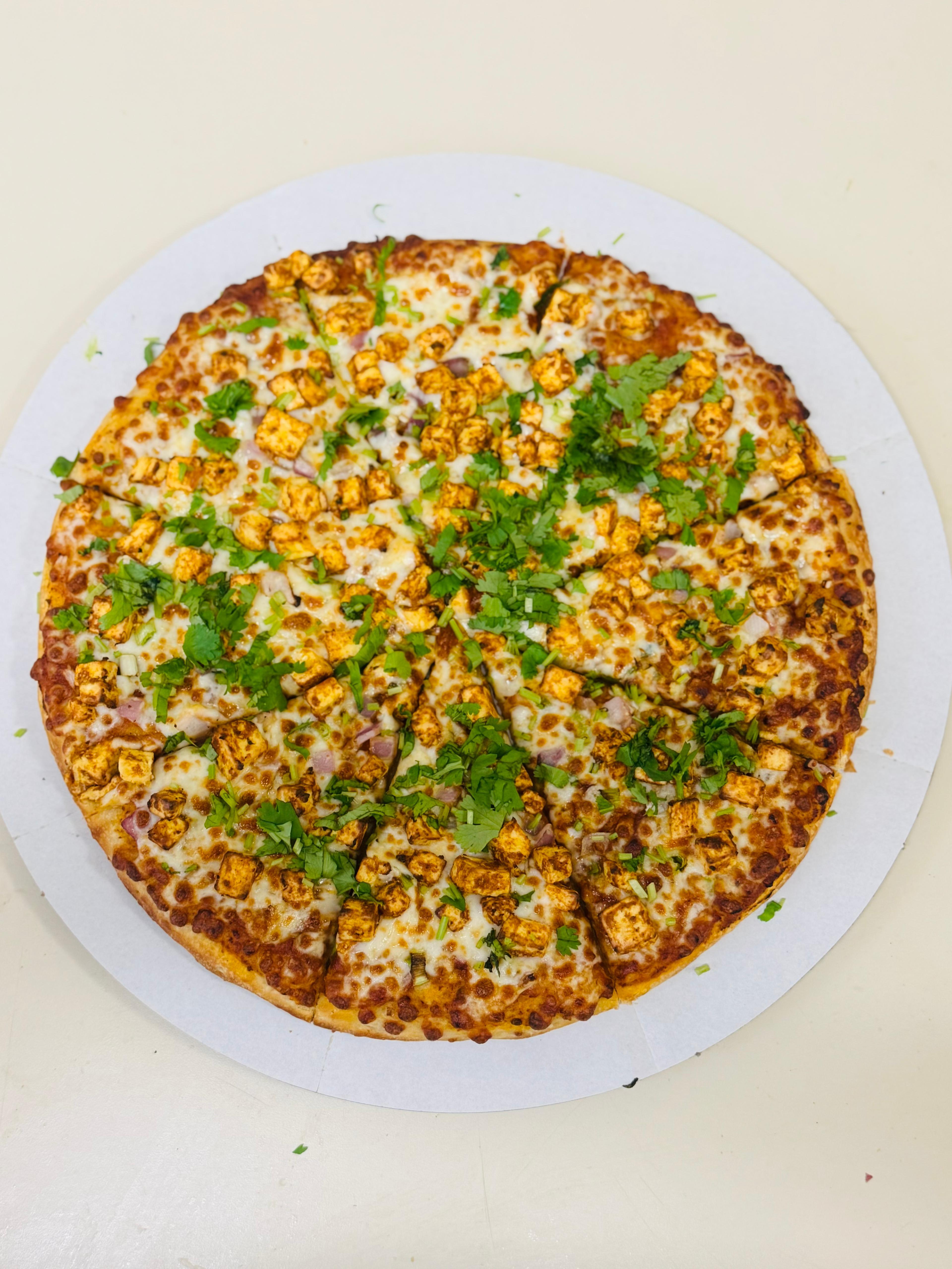 A luxurious base of rich tikka sauce crowned with creamy mozzarella, red onions, and tender cubes of marinated paneer tikka, finished with a flourish of fresh cilantro and crisp spring onions for a vibrant, aromatic finale. — "Vibrant, flavorful, and irresistibly satisfying in every bite