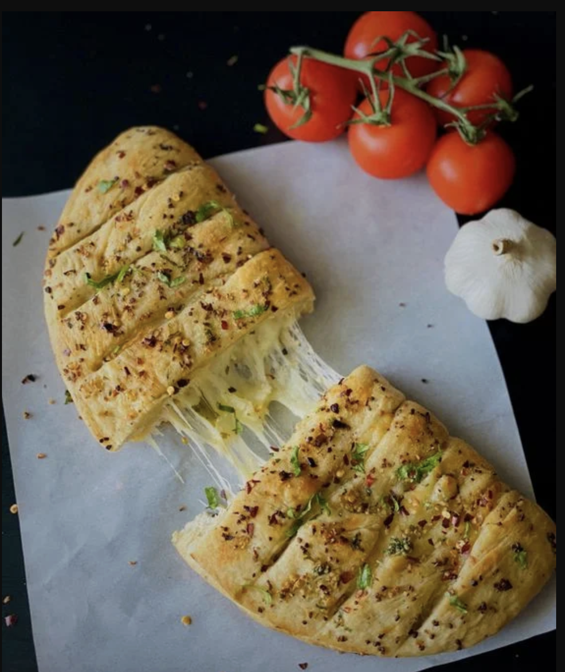 A garlic lover’s dream – warm bread stuffed and layered with gooey mozzarella, garlic butter, and herbs, then baked to a golden finish. Cheesy, melty, and utterly irresistible.