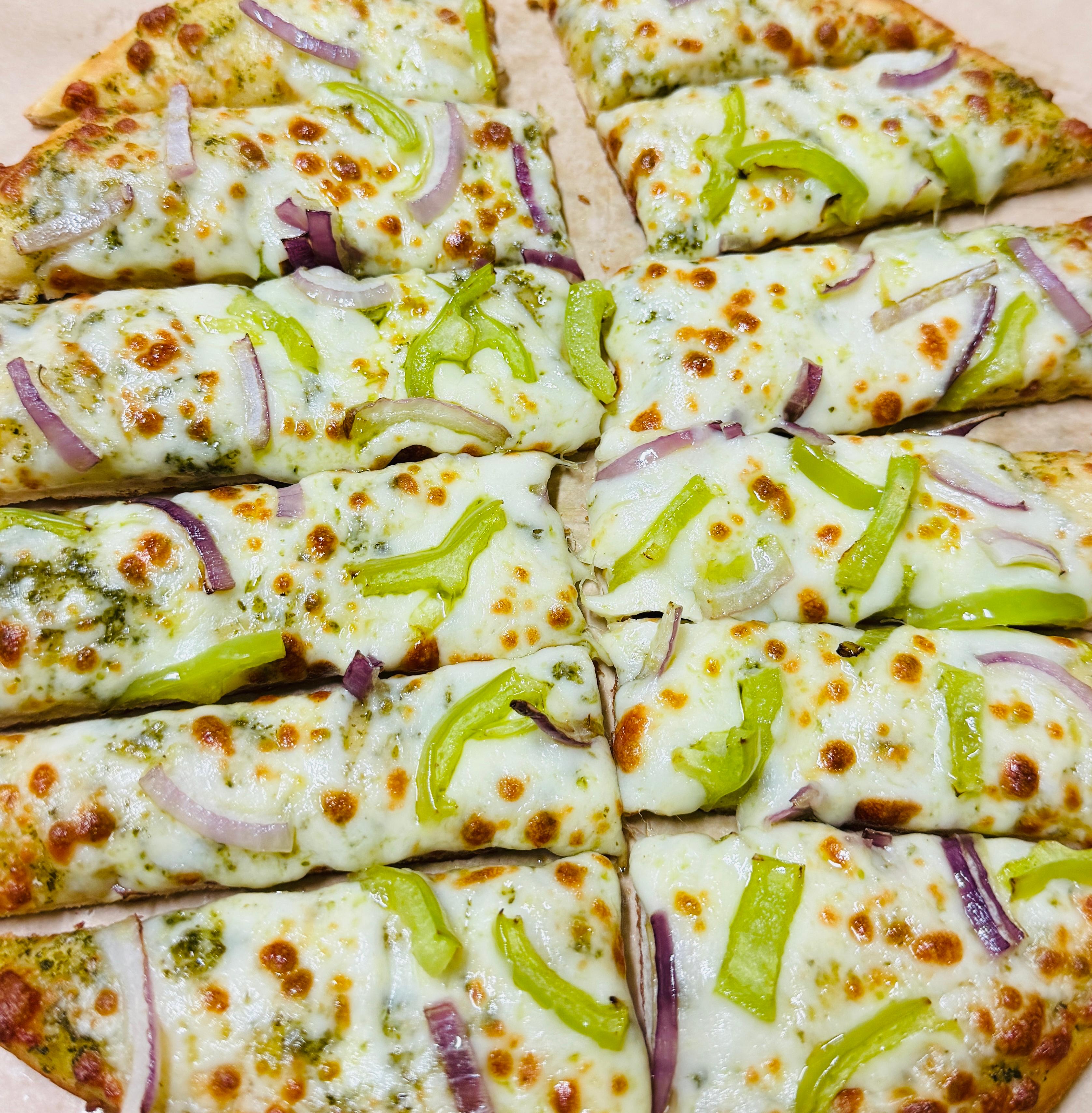 A rich and creamy pesto sauce base crowned with velvety mozzarella, tender white chicken, red onions, and grape tomatoes, finished to perfection for a vibrant, aromatic, and indulgent experience. — “every bite bursting with fresh, savory goodness.”