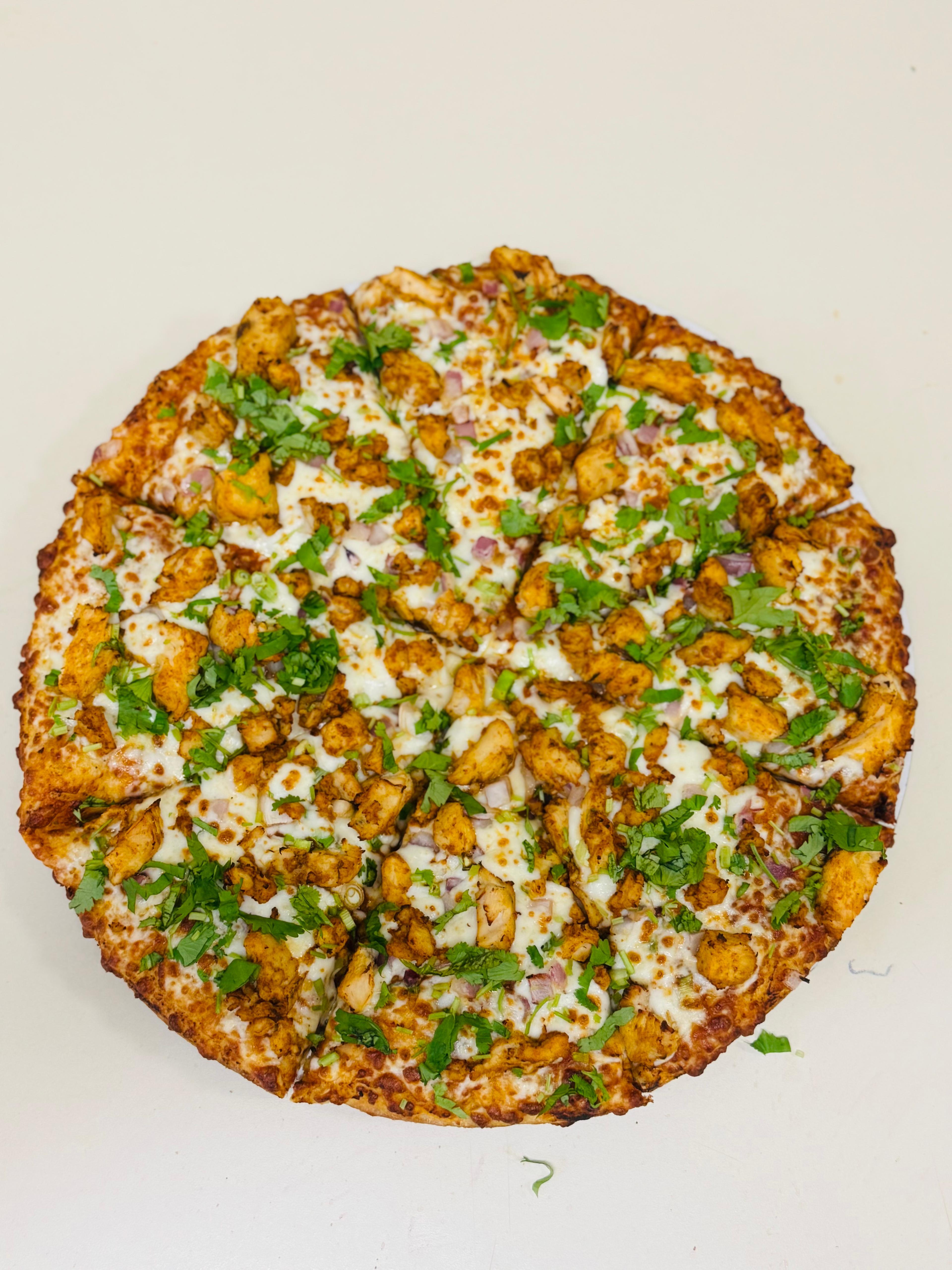 A fragrant curry sauce base, mozzarella, layered with tender Chilli chicken, red onions, and vibrant bell peppers, finished with fiery jalapeños and a delicate sprinkle of fresh spring onions & cilantro. — "where East meets west in the most delicious way.