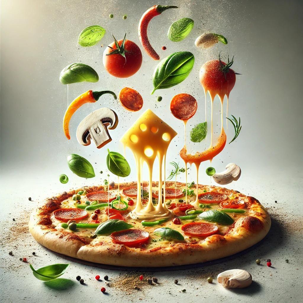 A vibrant red sauce base layered with mozzarella, mushrooms, crisp bell peppers, vine-ripened tomatoes, briny black olives, and a touch of fiery jalapeños, finished to perfection for a bold, aromatic, and colorful experience. — “bursting with flavor in every bite.”